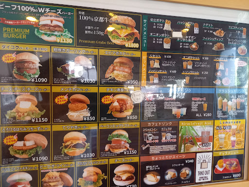 Read more注文してから作って頂けて、出来上がったら店員さんが席まで持ってきてくれて、できたてが食べられて、味もとても美味しかったです。 フード、ドリンク、セットのメニューが色々あるので、飽きることなく利用できると思います。 ファストフードのチェーン店はだいたい賑やかなので、正直入店したときは営業してないと思ってしまうくらい静かでしたが、裏を返せば騒ぐような人がわざわざ食べに来られるような、お手頃なお値段ではなかったです。 ですが、明るくて天井の高い、広くて綺麗で静かで、BGMも会話を邪魔しない程度にかかっていて、居心地も雰囲気も良い店内で美味しく食べられるので、相応の対価だと思います。因みに写真はソファー席です。 知る人ぞ知るお店のようで、入り口にはTVで取り上げられたことや、自分も見たことのある番組が来ていたり、たくさんの写真やサイン色紙が飾られていました。 フリーWi-Fiも利用できるみたいです。 駐車場も併設されてはいますが、道路向かいのスポーツジム?と共同で、区画と区画が少し狭い印象でした。 駐車可能なのは数えてないので厳密にはわからないですが、40台分くらいなので、車がいっぱいで停められなかったり、区画が狭くて停める自信がない方は、そこから見えているローソン(AEON亀岡側←これも見えています)の隣や、AEON亀岡の向かいにコインパーキングがあったと思います。たぶん提携はしていないのでお金はかかると思いますが、参考までに。 あと、≪2階は貸し切り≫と書かれた立て札が店内の階段のところにあり、外から2階が少し見えたのが、「HAPPY...