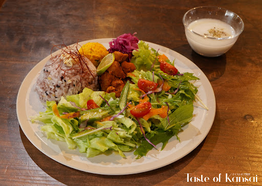 Read more亀岡にコスモスを見に来たついでに、気になるカフェにやって来ました。 こちらは古民家をリノベーションしたカフェ&ホテル(ホテルは準備中)で、Instagramを見てそのセンス溢れる 雰囲気に魅了されてしまった、笑 予約できる様なので妻と2人予約してから来た。 外観、内観ともに古民家の良さを活かした造りで良い雰囲気。 私らが入ってすぐに待ち合い席には4人ほどが待っていた。 週末は予約した方が良さそうです。 席についてランチメニューを拝見しましょう。