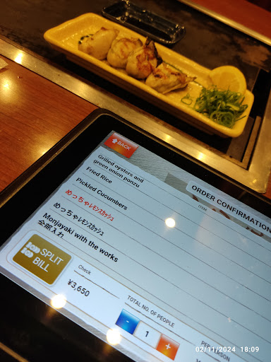 Visited on a Saturday. 4.30pm. Monjayaki was too salty for me. Cucumber appetizers too. Oysters were so-so maybe coz i was full. Pork Fried rice was really delicious though. Friend them on Line and you get a free drink. The staff that took my order was kind and could speak...