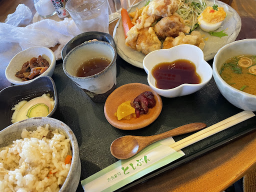 亀岡コスモス園へ行きランチ検索 以前から気になっていたので 行ってみました 駐車場も広くて安心 ちょうどお昼時だったので少し待ちました お店の方の対応も良かったです 今日の日替わりはとり天定食 食べてみたかったのでラッキー🤞 ご飯はかやくご飯か白ごはん 選べました。 もちろん かやくご飯 トレーいっぱいにお味噌汁 ちくわの煮物 温泉卵 お漬物 とり天もボリュームたっぷり 野菜サラダの横についていた茹で卵が 甘くて美味しい かやくご飯も出汁がしっかりきいていて美味しかったです これで税込1000円😅 びっくりです お腹いっぱいになりました^^ ご飯おかわりできるのかな? 男の方結構こられてました とてもおいしかったです^^ ご馳走様でしたー♪♪