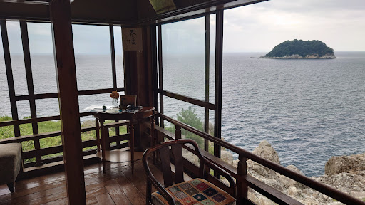 Read more香住の岬の突端にある景勝地、岡見公園内にある古民家喫茶。ここに入ると、この岬から拡がる海の上高くに「浮翔」できる、そんな驚愕の喫茶店。その順序としては、まずお店に入る前に岬の突端に立って、まわりに拡がる景色を十分見ておくことである。岡見公園自体が景勝地なので存分に心を天地のその彼方へと遊ばすことができる。その場所からこの喫茶店で喫茶している人が見えるが、みなさん外の景色を見ては忘我といった態である。