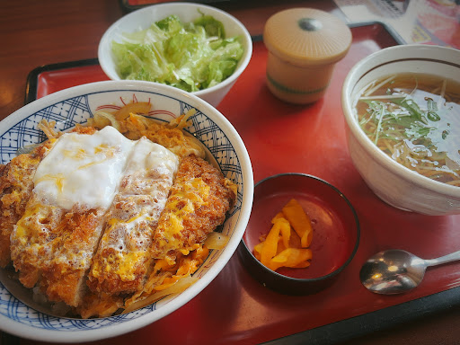 10年振りくらいにまるまつへ。しかも旅の途中のお初のまるまつへ。どんな味か記憶が曖昧でしたがとりあえず入店。確か前回もカツ丼だったような…正に曖昧な記憶からオーダー…程なく着丼…の前に無料のスープ!カップの怪しい緑色を見て思い出した具なしスープ!相変わらず化学調味料全開の味だ(笑)嫌いじゃない(笑)むしろ好きだ!