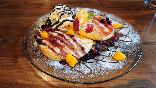 日曜日の16時前の訪問。こちらのカフェは以前から知ってはいましたが、立地の問題から訪れる機会が今までなく、今回が初めてです。到着してまず思ったのが、このカフェ大丈夫か?というもの。南北と西を山の斜面に囲まれており非常に暗く、且つお客が一人も居なかったので、何とも寂しい雰囲気。恐る恐る(失礼ながら)階段を上がり中へ入ると至って普通のカフェで一安心。デザート目的でしたがデザートメニューは3つのみ。プリンとチーズケーキとトロピカルパンケーキです。プリンとチーズケーキはワンコインで食べれますが、パンケーキは1500円。いきなり値段が跳ね上がります。間の料金設定(800〜1000円)のデザートメニューを設けられてはどうでしょう。お値段も量もボリュームがあるパンケーキでしたので、食後のデザートとして食べるにはハードルが高いように思います。注文したのはトロピカルパンケーキ。パンケーキ2枚と、バニラアイス、生クリーム、MIXベリーが散りばめられて、ボリュームしっかりあります。ベリーが全て冷凍なのが残念です。時期的にフレッシュなイチゴは手に入りやすいはずなので、この辺りは努力してほしいです。ボリューム以外は普通の域を出ないパンケーキといいますでしょうか。美味しいんですが、もうひと頑張りお願いします。☆−2にしたのは、お店の外が光量的にも雰囲気的にも暗く不安になることと、パンケーキとしてはそこそこのお値段設定なのに普通感を脱しないってことで。スタッフさんの応対はgoodでした。ステーキやハンバーグの評価が高いようなので、次回は是非ステーキを食べに行きたいと思います。