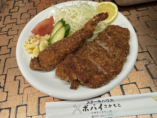 Read moreとんかつとエビフライの定食いただきました。私はとんかつ大好物!更にエビフライも好き❤️このセットは夢のよう!で、寄ってみましたが、うん🧐衣が固い💦油が古い?真っ黒😣そーゆー油なの?肉普通。エビフライは大きなエビでした。マカロニサラダがビックリするくらい美味しかった😃マカロニサラダおかわりしたかった❤️口コミ高評価だったので期待して行きましたがちょっと残念。 トイレは店の外にあり、和式でした。 次回行く機会あれば、ステーキ...
