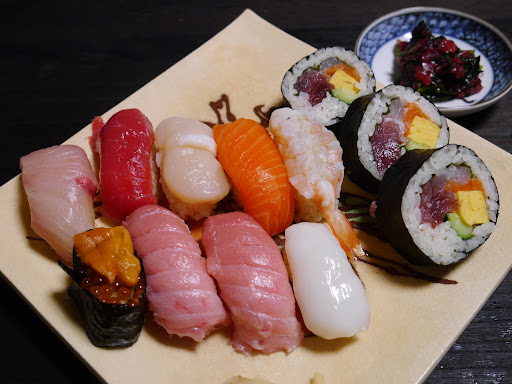 道路を挟んで斜め向い側にも駐車場あり。路面は部分的に砂利や草。 【注文方法】 口頭にて。 今回は 【特上寿司】 【上寿司】 【並寿司】 【茶碗蒸し】 を注文。 【待ち時間】 16:33、駐車場到着 ※前待ち客0組 16:54、入店・着席 16:57、注文 17:03、後客入り始め。 17:14、茶碗蒸し到着 17:21、味噌汁到着 17:22、寿司連続で到着 17:50辺りでテーブル席満席 【特上寿司】 内容は写真参照。