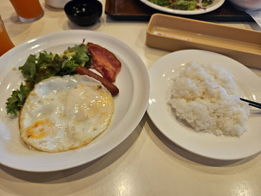 2025/9訪問 東京の友人宅へお米を届ける為に、朝早く家を出た。 朝食を食べる為に、数年ぶり?のガストへ。 席に座りタブレットで、モーニングメニューから、私は目玉焼き&ベーコンソーセージセット700円。 主人は、よりどりバランス朝定食850円を。 まず、見た目がやばい。 目玉焼きは両面焼きにしたので仕方ないが、ソーセージはしわしわ、ベーコンはカサカサ、ご飯はいつ炊いた?状態。 主人のソーセージとベーコンは普通だったが、魚が臭くて食べられないと。 スープバーはジンジャーのスープで、具材の玉ねぎとコーンは掬えないほど少量しか入っていない。 スープバーとドリンクバーを何度も利用する人じゃないと、コスパが悪すぎる。 総じて、ビックリする位美味しくない。 これに1550円払うなら、お隣の牛丼チェーンで鮭の朝食食べればよかった。 注文、配膳、会計等、一切店員さんと接することが無...