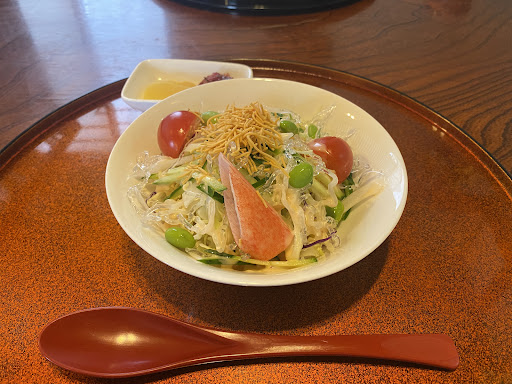 まずサラダはメイン前に満足できるだけの量があって、カニカマや海藻など海鮮感のある風味でとても美味しかった。 上に乗ってる麺のトッピングもパリパリしていて食感も楽しめました。