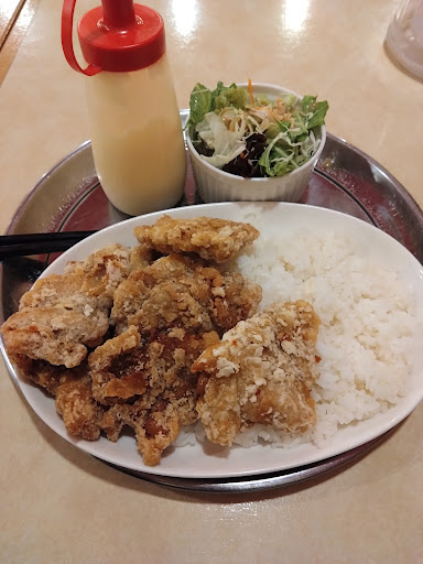 肝心の唐揚げは薄く叩き潰したような特殊な形をしている。少し油切れが悪いが衣はサクサク系、中は柔らかく味もしっかり付いている。 提供されるときにマヨネーズ(容器は必ず油でベタベタ)が付属してきて、卓上には醤油や塩が完備され、味に飽きるということはまずないだろう。 高くなってからなんか美味しくなった気がする。 唐揚げハンターも納得のクオリティである。