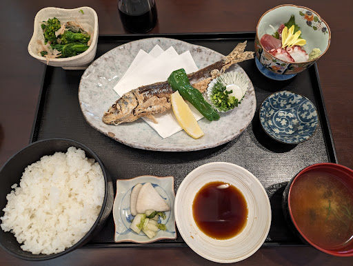 いわし唐揚げ定食を注文したところ、大きないわしを丸ごと揚げたものだった。頭から丸かじりで食べられるが、大きないわしなので背骨は少し硬かった。頭部はパリパリで美味しい。刺身2品付き...