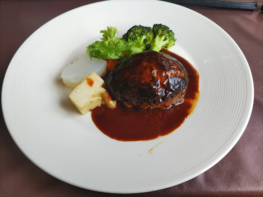 ・メインは種類から選べ「鮮魚のポワレ」「まごころ豚のグリル」「地鶏の皮パリ焼き」「ブランド牛・豚のこだわりハンバーグ」の4種類より、ハンバーグを選択しソースもデミグラスとバルサミコ酢から選べる、粗引きのお肉で噛みごたえと肉汁が心地良いです