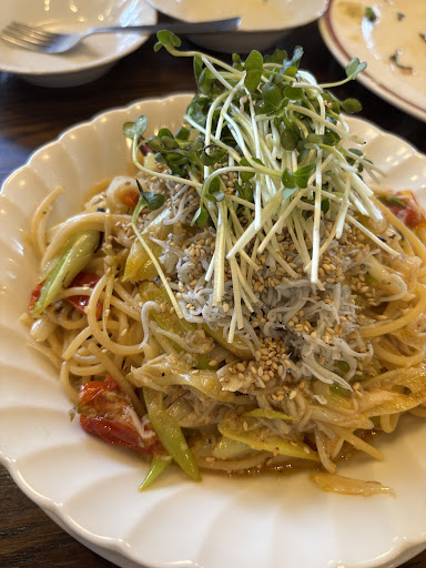 しらす長ネギセミドライトマトかいわれ白胡麻のペペロンチーノは、長ネギの甘さ、しらすの旨みがしっかり出ていて超絶品です。 これが忘れられなくて遠方からでも通いたくなります。