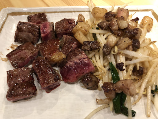 生野菜サラダに2種類の部位のステーキ。ニンニクや焼き野菜。ステーキの脂身をカリカリに焼いてモヤシの上にトッピングしたもの。ご飯に味噌汁、食後にアイスコーヒー。 このお値段でこんなに食べちゃっていいの?って感じでした。もちろん味も焼き方も最高でした。