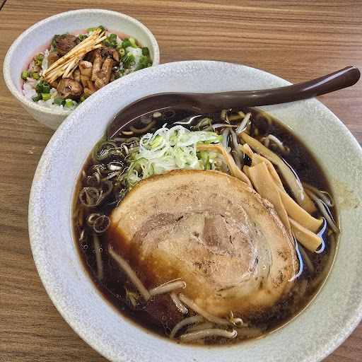 メニューもシンプルで麺(ラーメン)は6みそが生姜みそ、みそと辛味噌の3種類、醤油が醤油、あっさり醤油の2種類(あっさりは和風だしスープ)と塩の6種類 トッピングは4種類とご飯ものはチャーシュー丼とライス3サイズ 醤油ラーメンにチャーシュー丼をセットでオーダー