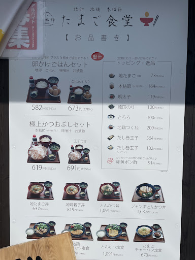 Read more二人だと横並びの席に案内されますが、椅子が固くて座布団も置いていなくお尻が冬は寒いです。 お水は机の上に置いていますがお茶は置いていないので取りに行くことになります。 2人で定食を頼んでも席がいっぱいいっぱいで物が置けるスペースがすくなく危ないです。 卵メインなのでお肉系を頼んでも特に美味しいこともなく、卵かけご飯を食べに行くぐらいで行くのがいいかと思います。 しかし卵食べ放題と言っても3種類ぐらいしかなく、また食べ放題にしても3種類も食べられないのでコスパもいいのか悪いのかわかりません...