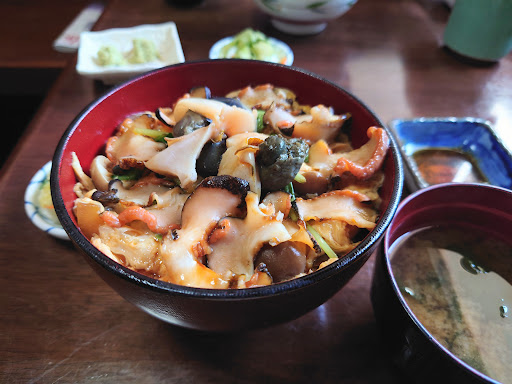 Read more旅行の最後の昼食で伺いました。この2日間の旅行の中でいちばんおいしく満足感のある食事だったかもしれません。 午後12時半頃予約なしで来店すると、注文が3卓分立て込んでいてだいぶ待ってもらうことになるかも、と伝えられました。15時半の電車の時間まで余裕があったし食後のカフェをあきらめればいいと思ったのでのんびりと待たせてもらいました。 結果1時間弱待ちましたがおいしいお茶が急須にたっぷりとあったし、スマホで動画などみていたらあっという間で苦ではなかったです。私も普通の旅行客だったらこの気持ちにはなれなかったと思うので、旅行の最後の余裕あるタイミングで来られて運が良かったです。 お刺身盛り合わせ3000円とおらが丼1200円、天丼800円を頼みました。お刺身盛り合わせは豪華で12種類くらいものお刺身が盛ってあり、いろいろな味をたべるのが楽しかったです。特にアワビの味とコリコリ具合が好きでした。 おらが丼はあまりリサーチしないまま頼んでいたので冷たい丼ぶりかと思っていたのですが、さざえの卵とじ丼のようで熱々ほかほかでした!玉ねぎとしめじと多めの三つ葉の香りが良い祖母の料理を思い出すような味でしたがさざえの家ではたべられない特別感と食材の綺麗な切り方などから、ちゃんとお店の味でした! 特大のさざえの肝がほろ苦くてポイントになったし大葉入りのお新香もさっぱりしてすごく好きでした。 ここの口コミをみると5年前から多くの料理の値段が変わっていないと分かり、びっくりです。 忙しい中いれていただきありがとうございました。またいつか行ったとき続...