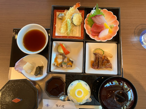 天ぷら、お刺身、焼き魚、肉料理など、少しずつ色々なお料理を楽しむことができます。 食後にはミニデザートも付いてきます。 コーヒーなどの飲み物は別料金ですが、食事中には温かいお茶をサービスしてくれます。