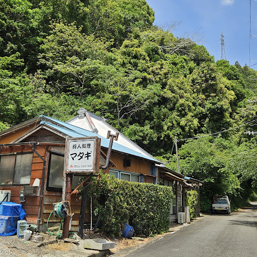 山奥のマタギ小屋をイメージして造られたというお店。 車は敷地内にギリギリ1台停められますが、前の道路に停めても大丈夫そう。 庭の犬たちが激しく吠えてくるので犬が苦手な人は気を付けてください。 ペットではなく狩猟犬だそうです。 ご主人が狩猟したジビエを奥様がお料理して出しています。 ランチは20食限定、夜は1組限定でコース料理が振舞われるそうです。 囲炉裏を囲む夜の時間も楽しそう。 ランチメニューはおらが丼(猪すき焼丼)のみ。 旬のタケノコがめちゃくちゃ軟らかくて美味しかった! この内容で¥1300はお安いです。 全く臭みがなく軟らかい猪肉は、言われなければ牛丼だと思うほど。 いや、言われても牛丼にしか思えない。 バラ肉にこだわっているそうです。 聞こえるのは清流の音と鶯と蛙の鳴き声。 本当に山奥に来たかのような長閑な空間でした。