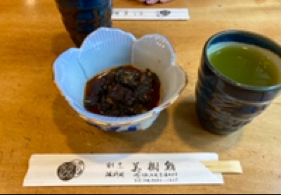 最後に伊勢海老で使った海老の頭で味噌汁を作っていただいたのですが千葉で採れるというハバノリという希少な高級海苔を入れていただきました。 歯応えあって美味しい♪