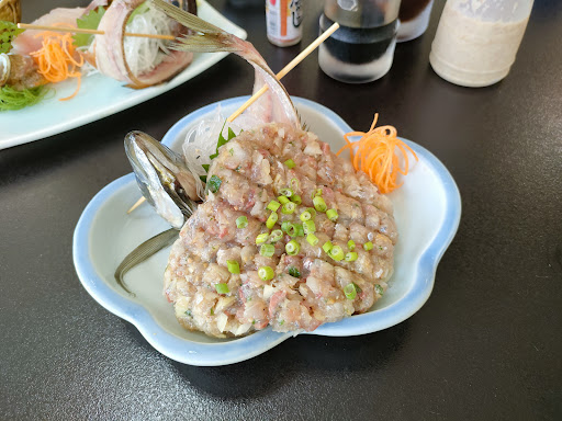 久し振りに入りました。 安房小湊から誕生寺の辺りには飲食店が幾つも有りますが、誕生寺の辺りは良店が多いと個人的には思っています。此方の店も良店で、その日に入荷した魚を安価で出しています。刺身、煮魚、焼魚、フライと、一通りのメニューは有ります。日によって魚は変わり、物によっては売切れの時も有ります。魚以外のメニューが無いので、麺類や肉類などが食べたい方には不向きでしょう。 席はテーブル4。小上がり3。カウンター無しです。温かい御茶はテーブルに有りますが、水は入口付近に有るのでセルフです。 頼んだのは《黒しびかます切身焼定食(刺身2点(ブリ、ハナダイ)、あじ南蛮漬付)》1700円。《あじなめろう》1000円。《さざえしぐれ煮》600円。合計3300円です。お会計は現金のみです。 注文を受けてから作るので、提供迄に少し時間が掛かります。なめろうは叩いて作るので、厨房から小気味よい音が聴こえました。 黒しびかますは初めて食べました。普通のかますに比べると別物と言うサイズで、脂が乗っています。身は淡白な白身ですが、程良い脂で美味しいです。身はパサつきが無く、フンワリしていました。かなり好みの味です。 刺身は臭みは無いですが、朝穫れではないみたいでした。水曜日で漁が休みだからかもしれません。南蛮漬は美味。単品で追加しても良かったかも。 さざえはホンノリと味が付いていて、磯の香りがしました。さざえの旨味も感じられて良かったです。 なめろうは白味噌を使っているみたいです。房州白浜出身の方はなめろうは赤味噌だと言っていたので、地域によって違うのかも。ややアッサリさしたなめろうですが、悪くないです。鮮度は朝穫れではなさそうなので普通。 観光地としては安価に魚が食べられる良店だと思います。複数人の場合は、刺身定食などを頼んで単品で煮魚や焼魚を頼んでシェアするのも良いかと思います...