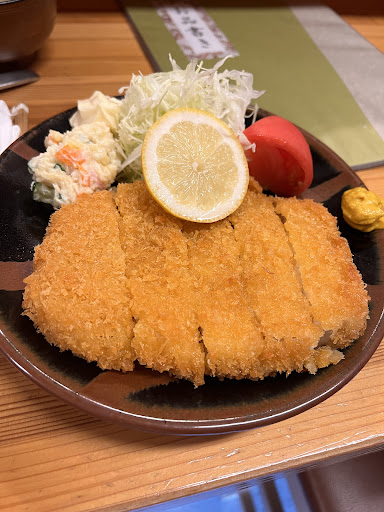Read more行こうとしていたお店が祝日で休みのため、近隣で評価が高かったため訪問。 写真で美味しそうだったとんかつ定食を注文。提供までは10分ちょっとでした。ロースの肉は厚み1cmくらいありボリュームがスゴいが、肉質は硬めで噛み切るのが大変なレベル。揚げる時間が足らなかったのか、両端の部分は肉が生っぽかったです。衣はガリガリと硬めで食べずらく、一口食べると肉から全て剥がれる始末。 味噌汁は小振りな蟹が半身入っていたが、なぜか蟹の味がせずただのワカメの味噌汁でした。 付け合わせのひじきの煮物とポテトサラダは美味しかった。 カツがきちんと揚がっていないものを提供するとか素人以下なので、再訪はないですね。 お客さんはほとんど地元の常連で、エアコンの効かないカウンター出入り口付近になってしまい、汗だくで食事することになった。 あと、写真では店舗の作りに高級感あるが、実際は自宅の一部を改築して設えてあるので、外を通る車やバイ...