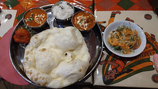 車を降りて入ろうかどうしよう!と考えてたら扉が開いて「いらっしゃいませ」と異国の人が出てきたので中へ!入って左がレジと厨房!奥に2人掛け、4人掛けテーブルがあり、空いてる席へ案内され着席。奥にさらに客席がある。インド特有のBGMが流れる中、2種のカレーセット注文!サラダとドリンクが直ぐ来て、10分程でカレーが来た。カレーは激辛にしたけど自分的には然程辛く無く何処かの料理みたく汗が出ると言うことも無い!ルーは甘め、ナンも甘め!チキンも甘い!やたらと甘い!ナンとライスはおかわり可能。2/3程食べた所でおかわりを聞きに来たので、ルーが余りそうと思いナンおかわりした。でも、1枚がベストかな!お腹いっぱい!2枚目のナンはインドの形してて中がクリーミィー!火が通って無い感じで冷た目!客はポツポツ来てる感じ!支払いして出る時も扉を開けてお見送り!店員さんは日本人の女...