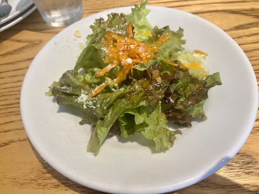まずはサラダ。量も野菜の種類も少なく、少しがっかりしました。