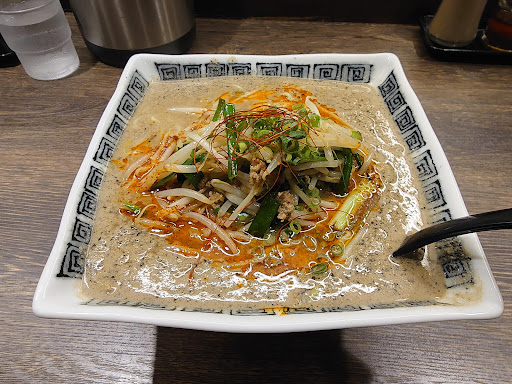Read more晩飯は、ラーメン新規開拓 途中気になるラーメン屋さんがあったがスルー 戻ろうかとも考えたが…なんか面倒😅 宿泊地まで来たので、ホテル周辺で検索 見慣れない四角い器にひかれ訪問☺ 一番人気をスタッフさんに尋ねると #黒胡麻坦々麺 との事なのでオーダー❤ 見た事無い器が登場🤣 しかもデカいし、重いし🤣🤣 スープ啜ると… ウマウマ〜❤ これ、ハマるヤツですね☺ 黒胡麻、ラー油、ニラがベストマッチ❤❤ しかしね…量が多い🤣 食べても食べても減らんねんな🤣🤣 しかも、食べてる時は辛くないんやけどね… 汗が途中から噴出するんよね〜 これなら辛いもの苦手な人も騙されて食べてしまうんやない? これね…いずれ無性に食べたくなるやつね🤣 ...