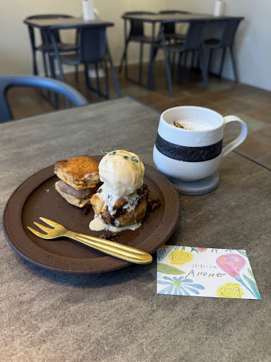 「あのね、あのね」とついつい教えたくなっちゃうような、トキメク大人の焼き菓子屋さん🕊️💐 エスニカさんの姉妹店であり、エスニカさんの店内にANONEさんの販売スペースがあります🫶🏻 エスニカinANONEさんとして営業されているので、時間帯ごとに違う美味しさに出会えるのが嬉しい〜🙈💞 時間配分は以下のようになっています。 ◻︎ランチタイム(11:00-)は、 エスニカさんのカレーメイン🍛 ※ANONEさんの焼き菓子のTAKEOUT可能。 ◻︎午後のカフェタイム(14:00-)からは、 ANONEさんメイン🕊️🥨 ※ANONEさんはEATINとTAKEOUTともに可能。 ※エスニカさんのカレーをいただくことも可能。 店内は、シンプルで落ち着いた雰囲気✨ コンクリート調のカウンターや壁と、木目調の机、まるみの可愛い椅子のバランスがとってもいいです♡ 店員さんもとても可愛らしくて優しく、素敵な方でした🥹🌿 丁寧で柔らかい接客のおかげで、 より一層心地よい雰囲気に感じましたよ〜♪ 今回いただいたのは、 ・自家製アイスクリームで食べるくるみのシナモンロール (¥500) ・栗クリームのスコーンサンド (¥430) ・加賀棒茶チャイ (¥682) 自家製アイスクリームで食べるくるみのシナモンロールは、ふわっと広がるシナモンの香りが食欲をそそるイートイン限定メニュー🥰 あたたかくリベイクされたシナモンロールの上に、まんまるの自家製アイスクリームがのっています🍨 生地は、むっちりもっちりとした食感! 噛むたびに心地よい弾力を感じました🥹🍴 中にはたっぷりのシナモンと胡桃のキャラメリゼが🐿️🧺 シナモンのスパイス感と、カリッとした胡桃の香ばしさが絶妙なバランスで、どこを食べても幸せでたまらなかったです🤎 自家製アイスクリームがとろりと溶けて、生地に染み込む瞬間も最高だった〜🥹♪ 最後のひと口まで夢中で食べてしまいました💕 栗クリームのスコーンサンドは、一口食べるたびににっこりと幸せな気持ちになれる逸品🌰🍂 スコーンはサクッと香ばしく、ほろほろっと崩れていく軽めの食感です😮🍴 そこにたっぷり挟まれた、なめらかな焦がしバター入りの栗クリームが最っ高、、、🥹🌰! ほっくりとした栗の自然な甘みとバターの深みが相まって、上品でリッチな味わいを楽しめました🧈♡ ドリンクと一緒に、ゆったり楽しみたいおやつです🫶🏻 加賀棒茶チャイは、ほうじ茶の香ばしさとスパイスのやさしい刺激が絶妙に調和した一杯😚✨ ほうじ茶特有の香ばしさがふわっと広がり、その後にチャイのスパイスがじんわりと感じられます♩ ミルキーでまろやかな味わいが全体を包み込み、優しい甘さがじんわりと染み渡る感じがたまりません🐄🥛 飲むたびにほっと癒されました〜(´꒳`) 実は他にも迷っていたドリンクもあったのですが、店員さんに相談した上で、このドリンクにして超大正解◎ じっくり味わいたくなる、ほっこり系のドリンクでした🥰 おやつもドリンクも美味しくって、雰囲気も素敵で、帰っている途中にもう行きたくなってしまいました🥹✨ ...