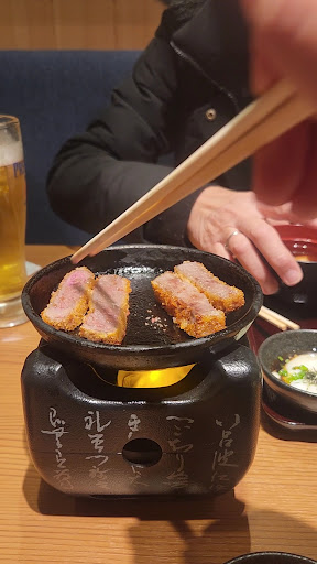Mum and I's first meal in Kanazawa and we wanted to try something new! We came right when they were opening for dinner at 4.45pm and were provided with a very informative English menu. Our server was great at explaining how to eat our gyukatsu and what was on our trays. We ordered a large sirloin set and a medium chuck flap set. Both were already cooked to medium rare but we stated we wanted to cook via flame for the novelty. Also tried the matcha beer, which was surprisingly good! Personally think it's great value for what you get and we will be leaving full.