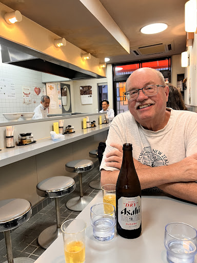 The chicken ramen broth was a lovely, homey savory work-up —. no salt bomb residue here! The bowl came with generous noodles, bits of scallion, dab of chicken meat, touch of seaweed, so satisfying. The chef gave a nice pan-fry sear on a side of gyoza. With a bowl of rice and a large Asahi Dry about $19 USD for two — just what the...