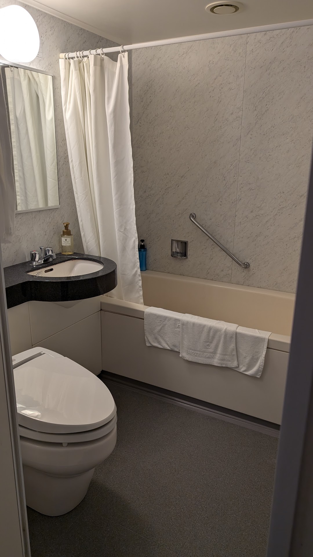 The rooms are big for Japan, especially the bathroom. There's a full-sized tub that we could stretch out in while soaking, or we could both shower at once without difficulty. There was a little booth seat and table in addition to the desk so that both of us had a place to park our laptops. The bed was only a semi-double but we found the firmness and pillows to be a welcome improvement compared to past business hotels. The only downside I can think of is that the fridge is weak.