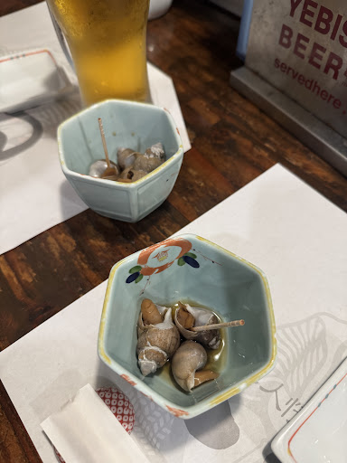 CONS: There is a 300 Yen charge per person but they give you 3 sea snails for appetizer. we ordered the fermented makrel. It was really salty. pickles were okay fried combo. Fish balls were okay, sardine plum egg roll was interesting, and the chicken was too oily. mushroom gratin with crab miso sauce. There was no crab in there. It was a tasteless mushroom pasta with cream of mushroom, the worst thing we had in Japan.