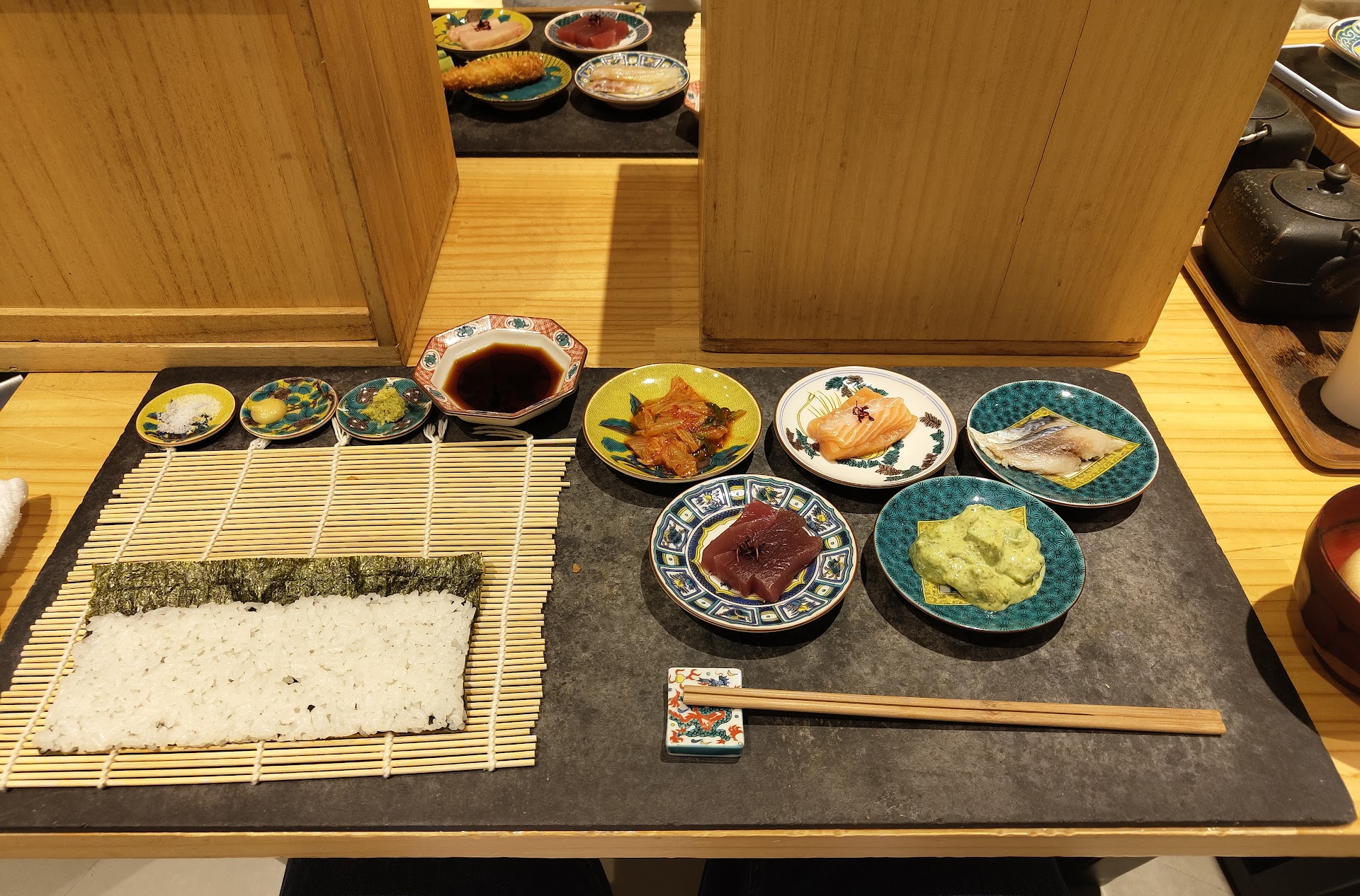 A brief tea experience, included as part of the premium menu, was the one highlight – well-explained and enjoyable. However, when I stepped away for a few minutes, I returned to find that all the food had already been served, with no effort to wait for me or explain anything to my husband. For context, at Coil, you assemble your own maki rolls from various toppings, alongside tempura and soup. The food was decent but nowhere near justifying the 8,800 yen price tag.