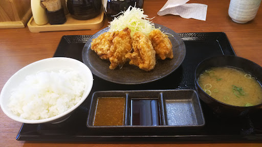11月6日、時刻は土曜の午後2時ほど。店内はすいているのに、駐車場は半分くらい埋まっていて謎でした。 思っていたよりも色んなおいしそうなメニューがあって悩んでしまった。 とりあえず自分は辛い物が好きだし、『赤辛定食』を頼みました。ポテトが下に敷かれているのはポイント高い。 店内はやはり午後3時なだけあり、他のお客さんは2組しかきておらず、広い店内でのびのびと食事ができました。 店員さんは4名くらいいたかなぁ。 日差しがまぶしかったけど、ブラインドを気が付いておろしてくれた。気配りができる店員さんもいれば、 最後に、「美味しかったです」、と伝えても無反応のスタッフもいて悲しかった。 5分くらいまって定食がきた。 大盛ご飯に無料でできるし、お味噌汁はあおさのお味噌汁が付きました。 『赤辛定食』の大判唐揚げは、ラー油でしっとりしていながらころもはカリカリ、ちょうどいいラー油に絡まった大判肉は外サクサクでいながらラー油の油の風味とあわさり、肉も中はふわふわしっとりで美味でした。辛さも割としっかりしていました。 ただ、ポテトはしっとりしてるのもあれば、カリカリのも半々くらいで少し残念。だけど、カリカリのポテトとラー油唐揚げがあうなぁ。量的には、55キロの男性が腹9分目くらい。 最初から最後までライスが進み、とても美味しかったです。