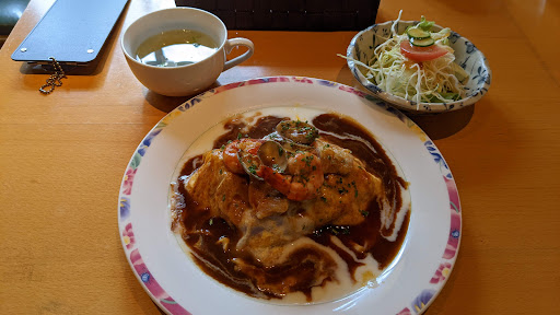 デミグラスソースが今まで食べたことのない味で美味しかったです。卵もフワフワ。 シーフードのオムライスをオーダーしたのですが、魚、海老、貝が思ってたよりもたくさん乗っていて嬉しくなりました。 どれも1000円前後の値段ですが、サラダと具の多いスープがついてくるのでお得です。