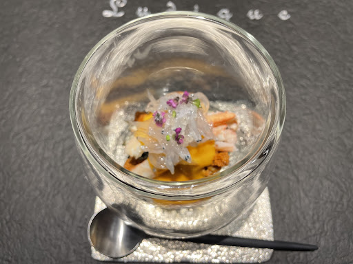 私達が伺った日は、ちょうど香箱蟹が解禁になったばかりのある日で、前菜は美しいグラスに盛られた香箱ガニの一皿だった。