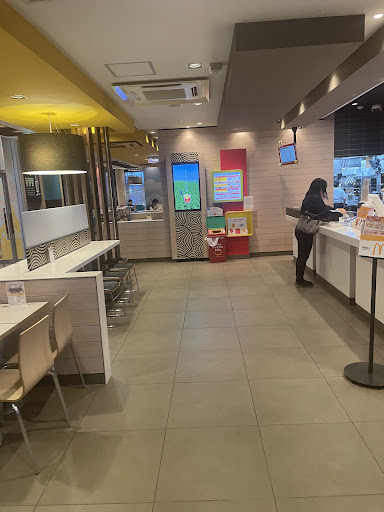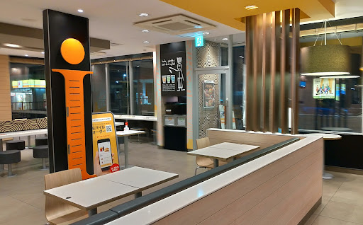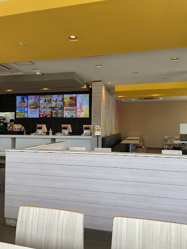 内観がちょっとオシャレなマクドナルドです。中央分離帯のような場所に立地していますので歩いて行けるかは不明です。