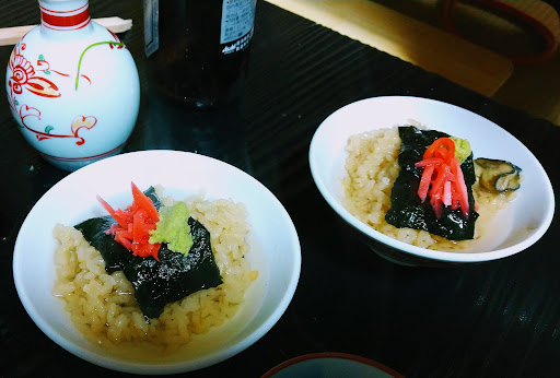 調理は女中さんがフルアテンドしてくれます。 すき焼きの様にお茶碗に玉子を溶いて、それで具材を頂くそうです。 それでは牡蠣を頂きます。 プリっぷりですw。濃厚で美味しい。臭みも無い。何と言ってもこの生姜風味の白味噌スープと合います合います。 味噌を吸った具材の深谷ネギも極太でホクホクのあまあま。 皆さんどんどんと牡蠣を食べていきます。本日4人で6人分の牡蠣食べましたw。最後は残ったスープで〆のうどん。牡蠣エキスたっぷりで最高。 そして牡蠣ご飯でラスト。これも美味しかったなあ。上に海苔と紅しょうが。 それにお出汁をかけてお茶漬け風に。