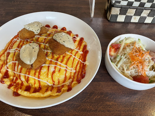 お味はそのまま、白身魚フライをトッピングしたオムライスだけど、マヨネーズがオムライスとは異なるアクセントになっていて、食が進む。 付け合わせのサラダで、外食の罪悪感も上手いこと払拭できる。