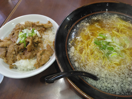 土曜の開店直後にお伺いしました。 開店の10時30分~11時までに注文出来るアーリーランチを注文…と思ったら券売機に無く、店員の方に聞いたらアーリーランチのメニューを渡してくれ席にて現金払いをとの事。 今回は豚丼と醤油ラーメンのセットを。 豚丼は香りよくお肉も柔らかでボリュームも有り、ただ紅生姜やお新香の箸休め的なのが乗ってたら更に良かったかも。 セットのラーメンは少し塩味が強いかな?と感じましたが、スープの味も麺の細さも好みの感じだし、やはり500円と言う価格を考えたら具無しでしたが満足いくセットでした! ちなみに以前はラーメンの味を塩、味噌、醤油から選べた様ですが今は塩と醤油のみとなってる様です。 鍋焼きチャンポン1.100円はグツグツと煮たつ土鍋での提供、グツグツしていて水分がとんでしまい味が濃くなって…と言う感じも無く最後まで熱々で野菜もたっぷり入っていて麺もモチモチとしてて美味しかったです! ギョーザ420円は羽根つきでパリッとしてる様な見た目でしたが、薄皮でちょっとフニャッとしてて皮のパリッと感やモチッと感が無いのが残念だったかな?と…ただ中の餡は大きめに切られた野菜たっぷりで美味しかったです。 びんビールは650円でした。 セットだと炒め物とかが有るので、単品メニューでも注文出来たら有難いなって思ったりですが、早い時間から営業しているのが有難く、美味しいラーメンを食べたいってなったら一...