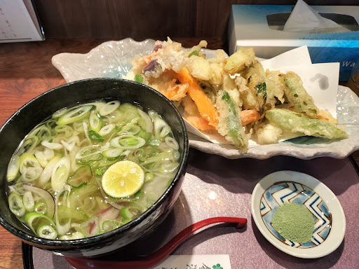 ネギ天うどん1390円を食しました。 大量のネギ野菜天麩羅が運ばれてきて驚きました。 揚げたての天麩羅は美味しいですが量が多すぎてくどくマイナス要因にしか。 うどんは特筆すべき点は無し。 値段相応ですが量半分で半額にしてほしい。 基本全て高額です。 客単価上げるために量多くしてるのでは? 写真もないので初見では量もわかりません。