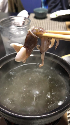 ◇ホタルイカのしゃぶしゃぶ つやっつやの生ホタルイカ。しかもでかい。 そのまま食べたい気もするが、しゃぶしゃぶの方がおいしいらしい。 出汁の中でワタが少し出てくるくらい5~6回しゃぶしゃぶしたら、だしポン酢につけて一口。 ぎゃー!うまーい! そんなワタが溶け出した出汁に生ワカメや野菜を入れてグツグツ。 石川県のブランド椎茸『のと115』がすんごい肉厚でうまい。