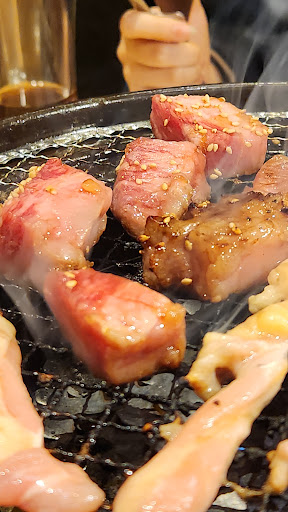 Read more土日に何回か予約無しで行ったがいつも断られやっと学習し予約して行けたお店(笑) どうやら改装したばかりで店内は綺麗✨️ テーブル席も多くて広い👍 前にあったのかカウンター席は奥に一席だけは確認出来ました😃 今、改装祝い中かハッピアワー期間中で早くに入店したらお得な特典があり良かった💕 お肉はどれも柔らかく美味で特に厚切りは凄く噛み応えがあり美味しいが顎が疲れた(笑) 焼肉のタレも甘めで、濃厚ではないけどお肉に絡ませれると美味しく頂きました😋 特にオススメなのが黒毛和牛サーロイン3秒ロースがマジで蕩けた😚 始めは卵黄と絡める事を知らなくて普通の焼肉のタレで食べてしまった💦 次は特典の無料すじポン💕 多分甘辛く煮てある牛すじにあじポンかけたと思われるがこれもなかなかの良い味してました😋 ただ、残念なのがユッケ寿司と冷麺でした🍣🍜 ユッケ寿司は特に変わった味も無くこれなら普通のご飯食べたかったと息子が我儘言う始末💦 冷麺も味がほとんどしなかったから酸っぱいもなぁんも特徴がなく普通に味の無い冷たい麺の印象になってしまった😅 でも、無料のアラ汁と卵のサービスは何気に嬉しい😄 デザートは普通に美味👍 テイクアウトもあるので実家のお土産とした喜ばれました🎵 店員さんもハキハキした声で対応も良かったのでまた予約してか...