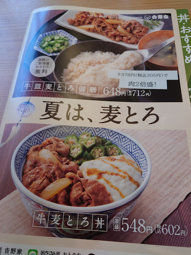 早い!安い!うまい!は今も健在ですかね。日曜日の20時に一人で利用しました。駐車場は広く停めやすいです。待ち時間なく着席しました。テーブル席とカウンター席があります。席の目の前にタブレット端末があるので注文します。迷うことなく注文完了。待つこと数分で提供されました。並盛り牛丼498(税込み)にサラダ味噌汁セット217円(税込み)をつけて、差額140円(税込み)で味噌汁を豚汁に変更可能なのでそれを頼みました。野菜サラダは和風とゴマドレッシングから選択できます。まずは何も足さないで牛丼を食べて、後はテーブルに備えてある紅生姜や七味唐辛子をかけていただきました。お店の滞在時間は15分くらいだったでしょうか。会計は各種電子マネー、現金が利用可能です。店員さんは元気に声かけしながら接客できていました。店内は照明も明るく清潔感があり、夜の時間帯だったのかジャズが流れていました。時間がないときにパパッと食べるのにも適していますね。また...
