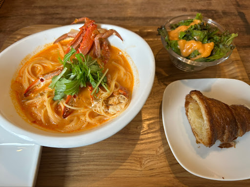 パスタのスープ一口飲んでみたら美味しい‼️ 丼サイズのお皿にパスタたっぷりでワタリガニは1.5杯入ってるし。 パスタの他にもサラダと飲み物、プレミアムバタークロワッサンの半分も丁寧にカットされてついてついてくる。 このクロワッサンがまたまた美味いのよね。 このボリュームとお味で1280円お安いわ〜 嬉しい〜