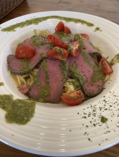 パスタは大蒜とバジルの香りが立ち、 トマトの甘酸っぱさが爽やか。 このトマトの酸味があるだけで、本当、最後まで美味しく楽しめる。 バジルソースを絡めて食べないと味は薄めと案内されましたが、そんな事ないです。十分に美味しい。 自家製ローストビーフもモモ肉を低温でじっくり。 柔らかいし味も濃い。