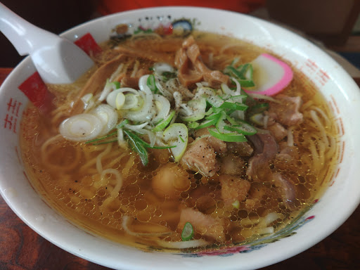 鳥もつラーメンのスープ表面には黄色に光る油。※もつの臭みをとる鶏油とかなんとか だが油もさらりとしており、スープはほのかに生姜を感じる、体に優しそうな透き通った味。全部飲み干した。