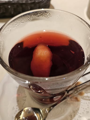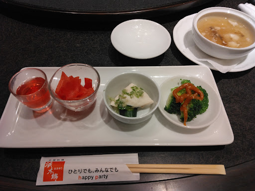 花珠ランチコースは、メインを選んで前菜3種類、スープ、デザート、ドリンク、ご飯or中華粥が付いています。大勢のお客さんは入っている割には、 テーブルと隣合うテーブルの間隔が広く...