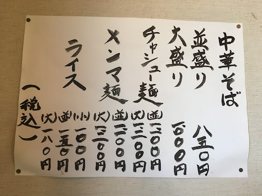 メニューは本店と同じく、中華そば一本。 並盛り、大盛り。 チャーシュー麺、メンマ麺。 ライス、ビール。