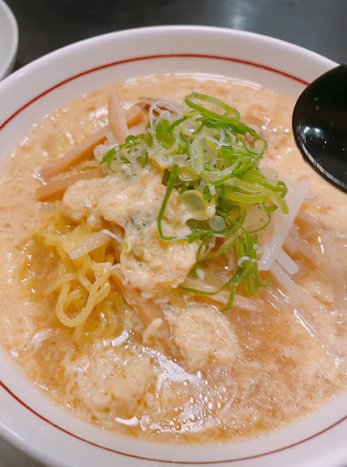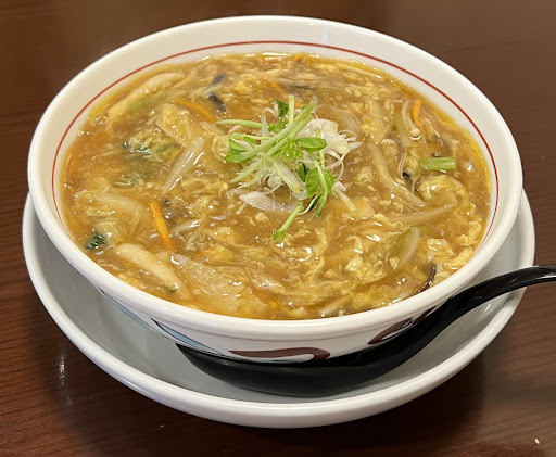 サンラータンメンは、餡かけと麺と、具材がしっかり絡み合って濃い味付けで美味しくてかぶりついて夢中でいただきました。 笑